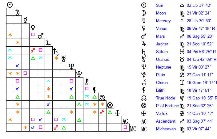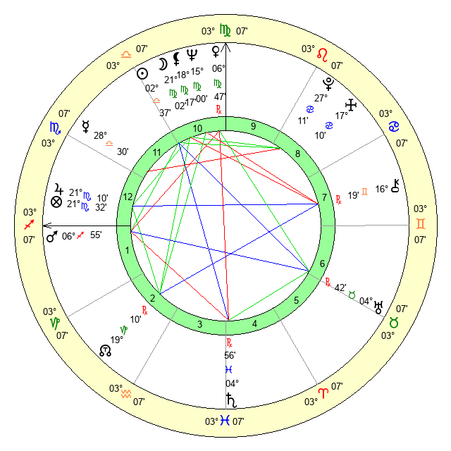 | Moon | 21 Virgo 4 | 27 Scorpio 17 | 1 Capricorn 59 |
