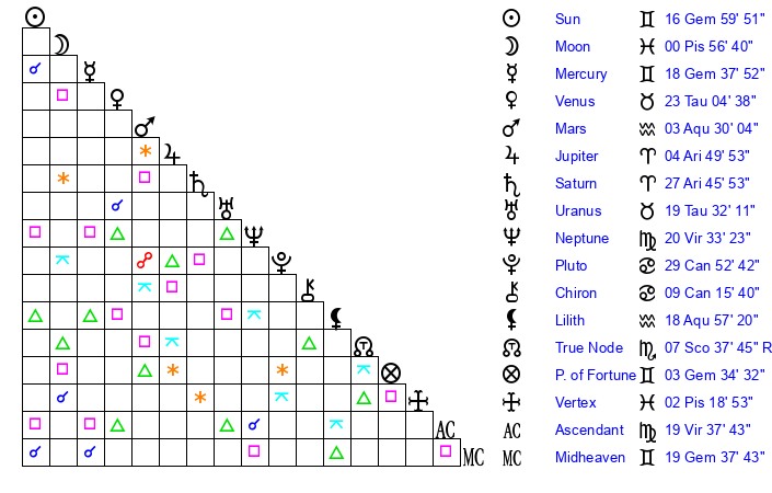 | Sun | 16 Gemini 59 | 18 Gemini 9 | 9 Virgo 19 |
