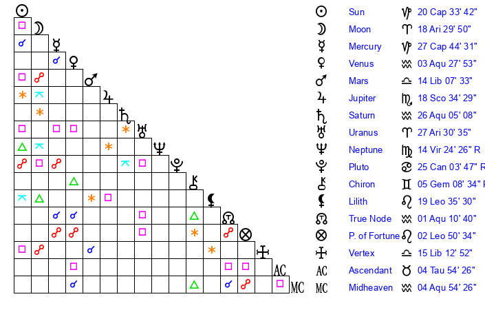 | Uranus | 27 Aries 30 | 23 Taurus 26 | 0 Taurus 49 |
