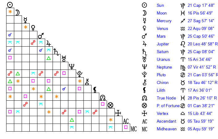 | Mercury | 27 Sagittarius 57 | 6 Capricorn 11 | 17 Aries 11 |