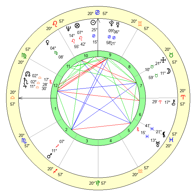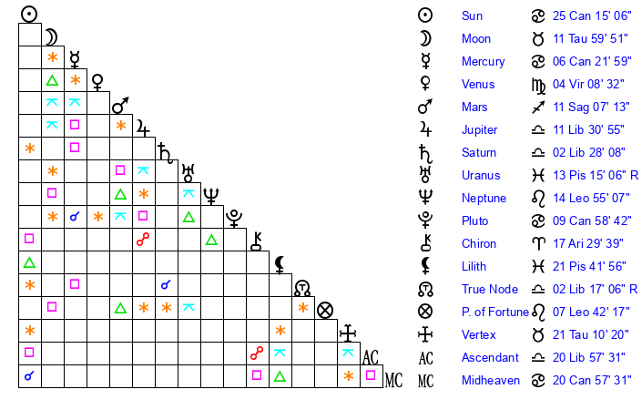 | Sun | 25 Cancer 15 | 26 Cancer 19 | 5 Scorpio 29 |