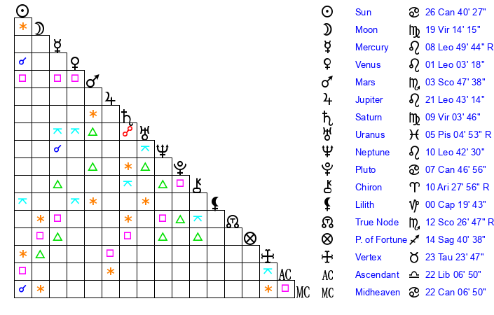 | Moon | 19 Virgo 21 | 19 Taurus 31 | 17 Cancer 29 |
