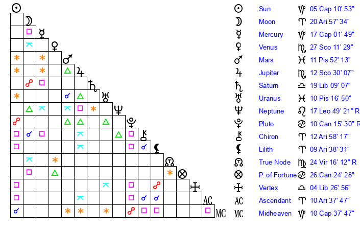 | Saturn | 19 Libra 46 | 25 Pisces 50 | 17 Libra 19 |