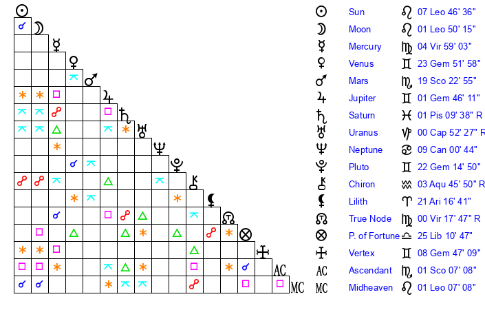 | Sun | 7 Leo 47 | 8 Leo 44 | 5 Sagittarius 49 |