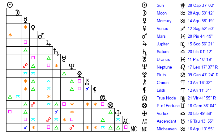 | Saturn | 20 Libra 39 | 16 Pisces 5 | 15 Libra 42 |