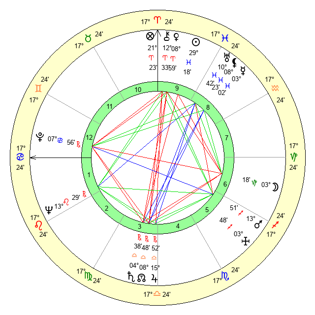 | Sun | 29 Pisces 18 | 0 Aries 20 | 9 Cancer 3 |