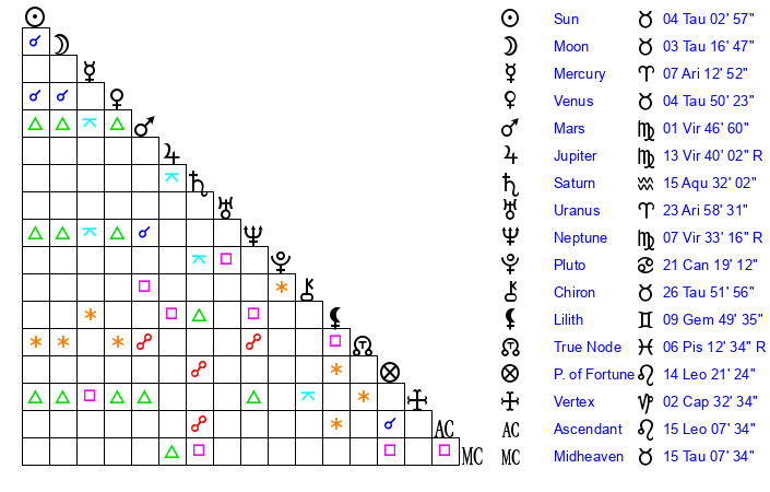 | Sun | 4 Taurus 3 | 4 Taurus 46 | 2 Leo 16 |