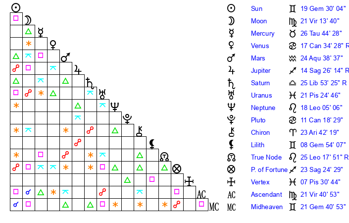 | Sun | 19 Gemini 30 | 20 Gemini 4 | 26 Virgo 28 |