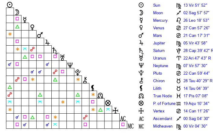| Sun | 13 Virgo 52 | 14 Virgo 21 | 16 Sagittarius 25 |