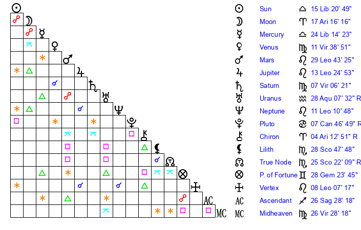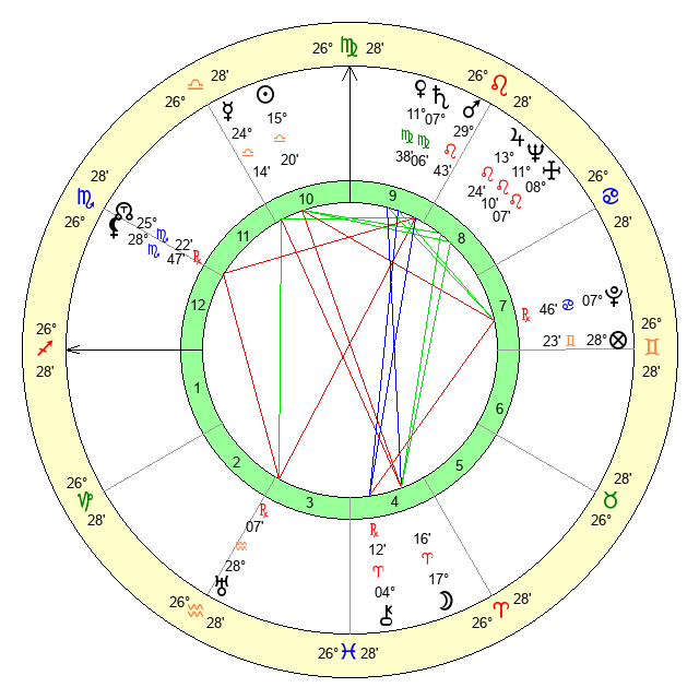 | Saturn | 7 Virgo 45 | 27 Pisces 0 | 11 Virgo 33 |