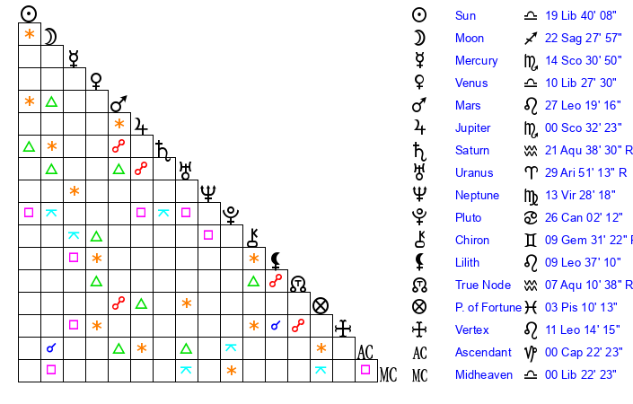 | Mercury | 14 Scorpio 30 | 10 Scorpio 15 | 29 Capricorn 25 |