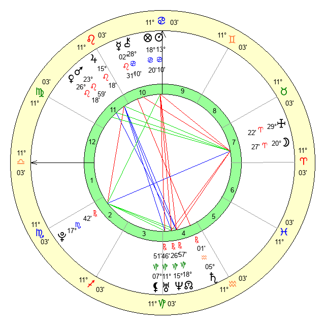 | Moon | 20 Aries 15 | 15 Scorpio 30 | 26 Cancer 8 |