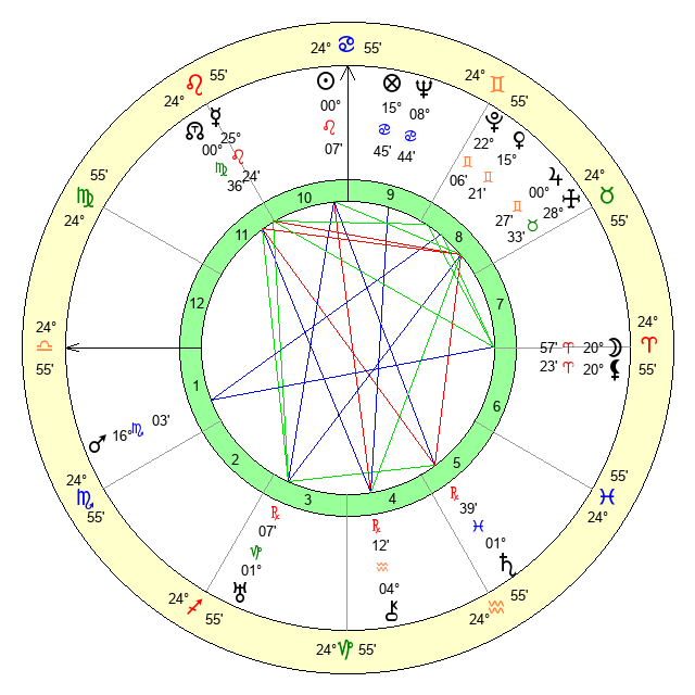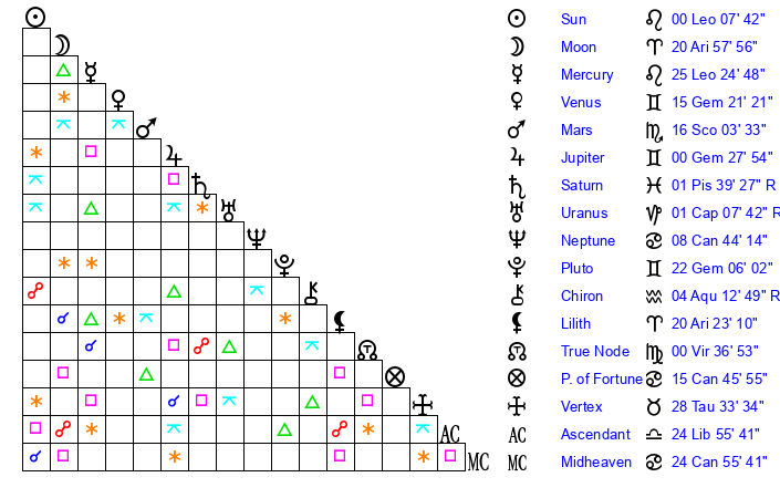 | Moon | 20 Aries 55 | 16 Cancer 48 | 5 Virgo 47 |