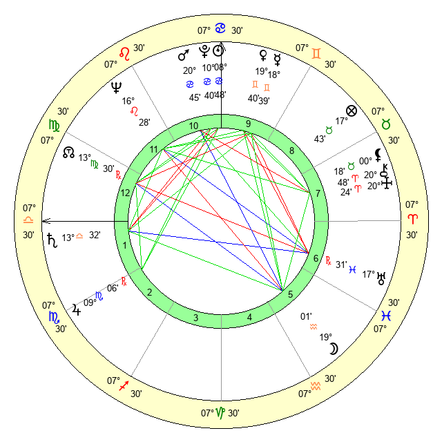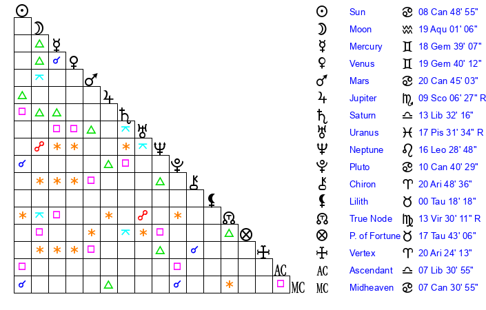 | Pluto | 10 Cancer 40 | 3 Aquarius 7 | 12 Cancer 22 |
