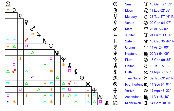| Sun | 10 Gemini 27 | 11 Gemini 27 | 11 Virgo 25 |