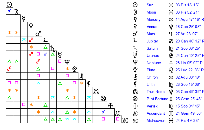 | Saturn | 21 Scorpio 37 | 19 Pisces 51 | 18 Scorpio 49 |