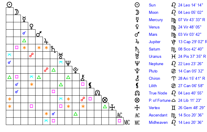 | Sun | 24 Leo 14 | 25 Leo 2 | 2 Sagittarius 56 |