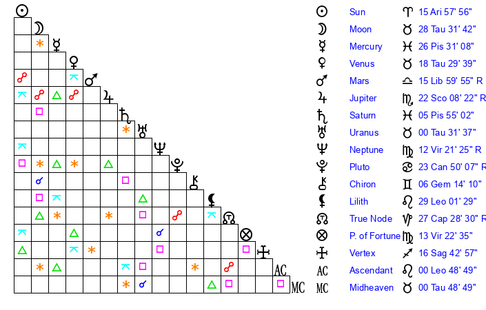 | Venus | 18 Taurus 29 | 25 Pisces 27 | 28 Leo 3 |