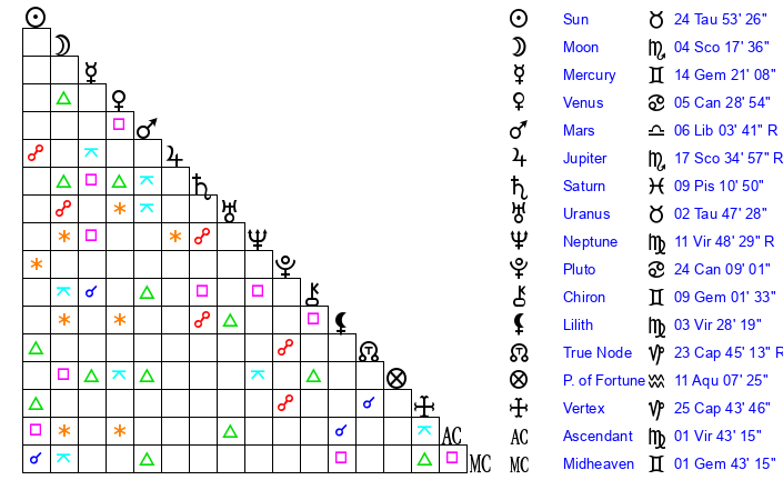 | Jupiter | 17 Scorpio 17 | 24 Gemini 38 | 14 Scorpio 52 |