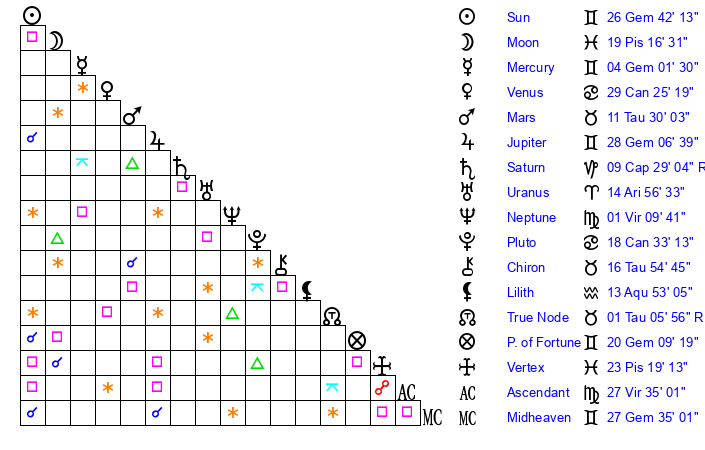| Sun | 26 Gemini 43 | 27 Gemini 42 | 27 Virgo 58 |