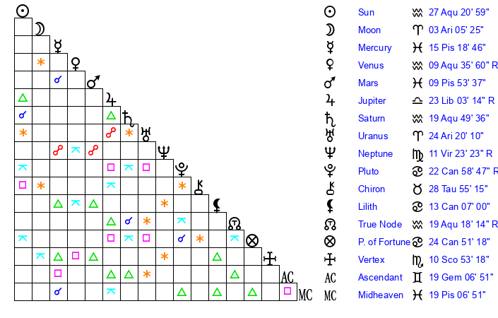 | Sun | 27 Aquarius 21 | 28 Aquarius 16 | 27 Taurus 3 |