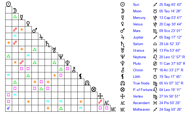| Moon | 5 Taurus 14 | 12 Sagittarius 4 | 2 Aquarius 21 |