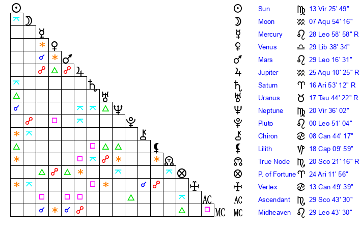 | Mercury | 28 Leo 58 | 8 Virgo 1 | 29 Sagittarius 27 |