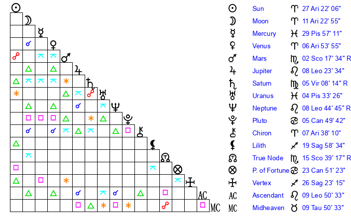 | Moon | 11 Aries 21 | 19 Sagittarius 7 | 16 Aquarius 32 |