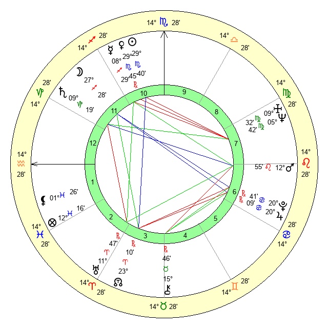| Neptune | 5 Virgo 43 | 29 Pisces 27 | 4 Virgo 22 |