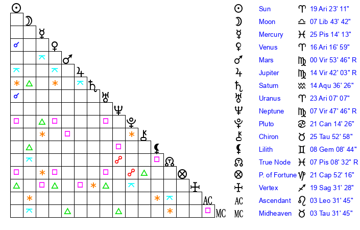 | Sun | 19 Aries 23 | 20 Aries 5 | 17 Cancer 57 |