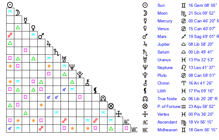 | Moon | 21 Scorpio 9 | 7 Scorpio 9 | 19 Leo 58 |