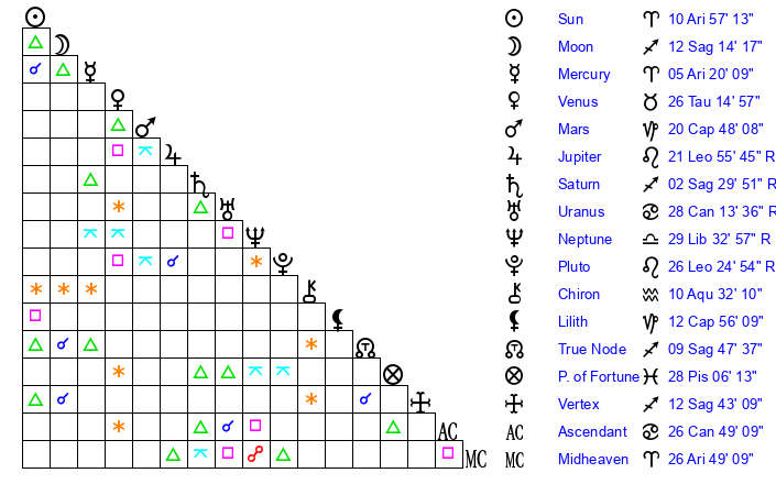 | Sun | 10 Aries 57 | 11 Aries 14 | 17 Gemini 50 |