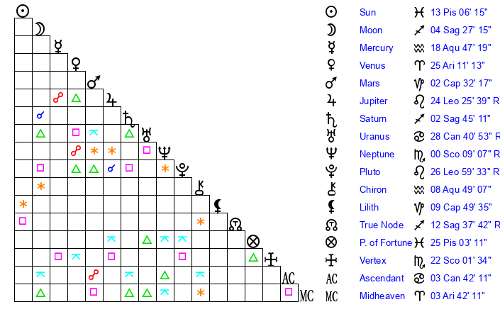 | Saturn | 3 Sagittarius 12 | 20 Pisces 57 | 0 Sagittarius 41 |