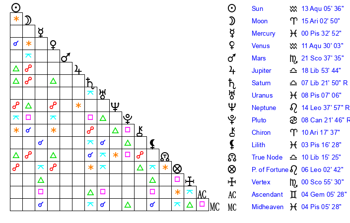 | Saturn | 8 Libra 4 | 17 Pisces 32 | 1 Libra 47 |