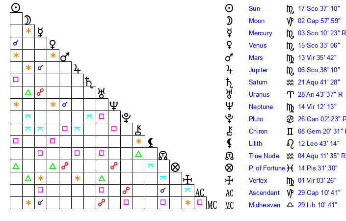 | Sun | 17 Scorpio 37 | 18 Scorpio 33 | 20 Aquarius 1 |