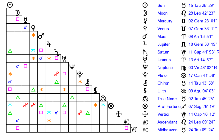 | Sun | 15 Taurus 26 | 16 Taurus 25 | 16 Leo 21 |