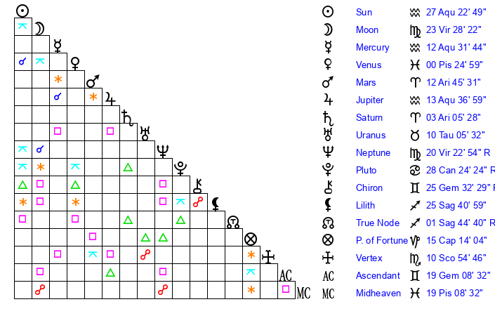 | Sun | 27 Aquarius 22 | 28 Aquarius 16 | 23 Taurus 13 |