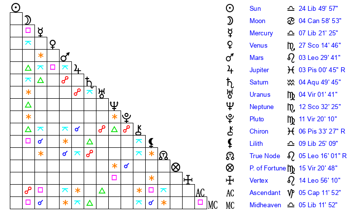 | Sun | 24 Libra 50 | 25 Libra 34 | 28 Sagittarius 20 |