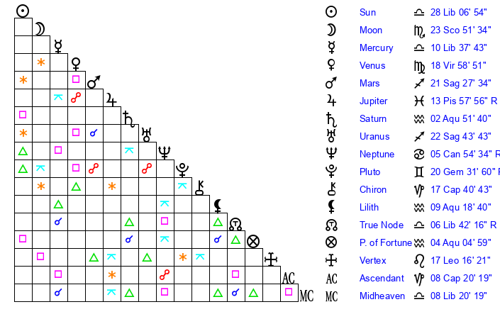 | Moon | 23 Scorpio 53 | 12 Scorpio 33 | 29 Aries 13 |