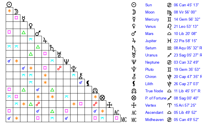 | Neptune | 3 Cancer 34 | 2 Aries 9 | 5 Cancer 51 |