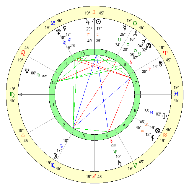| Sun | 17 Gemini 9 | 18 Gemini 9 | 18 Virgo 13 |