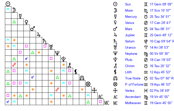 | Sun | 17 Gemini 9 | 18 Gemini 9 | 18 Virgo 13 |