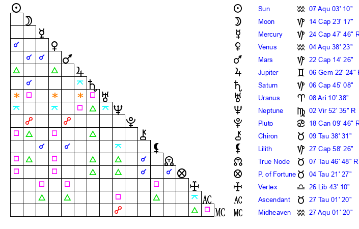 | Saturn | 7 Capricorn 2 | 16 Pisces 54 | 12 Capricorn 4 |