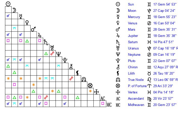 | Sun | 17 Gemini 55 | 19 Gemini 6 | 12 Libra 31 |