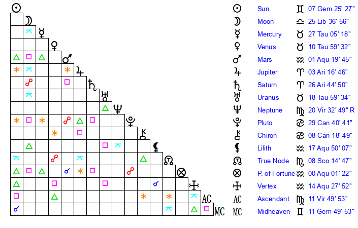| Moon | 25 Libra 35 | 14 Cancer 10 | 21 Sagittarius 3 |