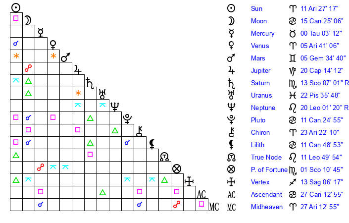 | Sun | 11 Aries 27 | 12 Aries 13 | 17 Cancer 53 |
