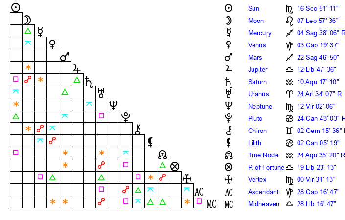 | Sun | 16 Scorpio 51 | 17 Scorpio 33 | 20 Aquarius 16 |