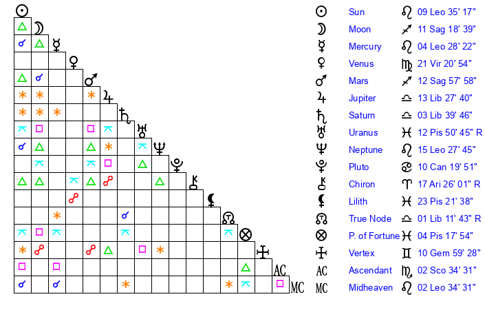 | Moon | 11 Sagittarius 18 | 23 Scorpio 31 | 8 Virgo 27 |