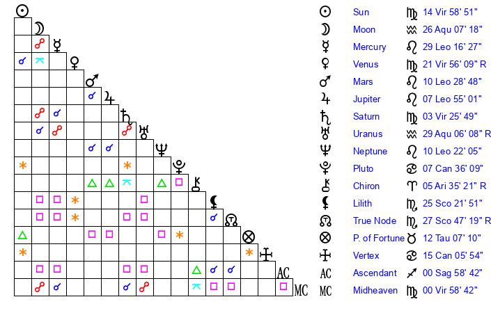 | Moon | 26 Aquarius 5 | 28 Pisces 56 | 14 Capricorn 40 |