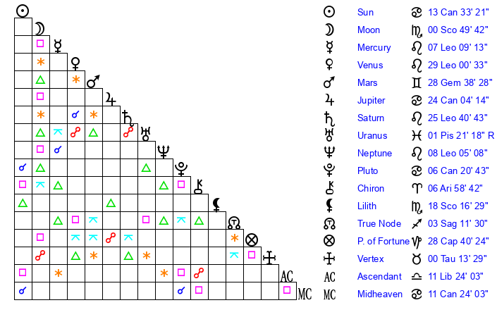 | Sun | 13 Cancer 33 | 14 Cancer 52 | 26 Libra 15 |